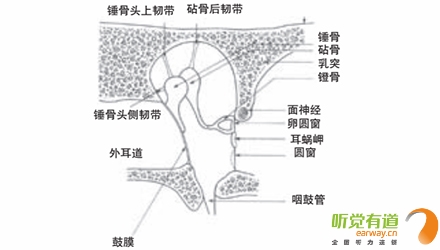 <span style="font-size:16px;"> 中耳結構包括鼓室、咽鼓管、鼓竇和乳突腔四部分。鼓室內有聽骨、肌肉、韌帶和神經。中耳是換能器,換能是將一種能量形式轉換成另一種能量形式,中耳通過鼓膜和聽骨鏈將聲能轉換為機械能,再由鐙骨底板將機械能轉換為內耳的液態能。</span></p><p><span style="font-size:16px;"> 鼓膜是中耳和外耳的分界,呈橢圓形,中間稍向內凹陷,色灰白,較透明,與耳道底約呈30°角。鼓膜寬約8mm,高約9mm,厚0.1mm,質地韌,其構造分三層:外層是皮膚層,中層由淺層的放射狀和深層的環狀纖維組成,它們使得鼓膜能承受一定的氣壓和水壓并抗感染,內層為粘膜層,與鼓室粘膜相連續。聲音的振動,即聲能,通過耳郭和耳道共振的加強,引起鼓膜隨之振動,鼓膜與中耳的錘骨相連,在正常耳,錘骨懸掛在自鼓膜頂端至下2/3處。錘骨柄的尖端將鼓膜頂向中耳,形成錐形鼓膜的頂,稱作臍。自臍向前下達鼓膜邊緣有一個三角形的反光區,名光錐,是外來光線被鼓膜的凹面集中反射而成。鼓膜下4/5為緊張部,上1/5由于缺乏纖維層而較松馳,稱為松弛部。鼓膜可分為前上、前下、后上、后下四個象限。兒童的鼓膜薄而有彈性,年齡越大,鼓膜越厚且越僵硬。鼓環將鼓膜固定在某一位置,使其成為在外耳和中耳之間的一層防水防氣的屏障。</span></p><center><span style="font-size:16px;"><img alt="" src="/upfiles/201810080137189845.png" width="440" height="250" /></span></center><p></p><p><span style="font-size:16px;"> 中耳鼓室</span></p><center><span style="font-size:16px;"><img alt="" src="/upfiles/201810080137242362.png" width="440" height="250" /></span></center><p></p><p><span style="font-size:16px;"> 正常鼓膜像(左)</span></p><p><span style="font-size:16px;"> 在中耳腔內的聽骨是人體最小的骨頭,分別叫作錘骨、砧骨和鐙骨。這些聽骨由韌帶連接并懸掛起來形成了聽骨鏈。錘骨柄附在鼓膜上,錘骨頭與砧骨頭形成錘砧關節,砧骨底與鐙骨頭形成砧鐙關節,鐙骨底板由環狀韌帶固定在卵圓窗上。聽骨鏈利用杠桿原理使來自鼓膜的機械能放大,傳遞到卵圓窗。</span></p><center><span style="font-size:16px;"><img alt="" src="/upfiles/201810080137303051.png" width="440" height="250" /></span></center><p></p><p><span style="font-size:16px;"> 聽骨鏈</span></p><p><span style="font-size:16px;"> 咽鼓管是中耳通氣引流的唯一途徑,也是中耳感染的主要途徑。它的一端開口在較高的中耳鼓室腔,另一端開口在較低的鼻咽部,通過咽鼓管在鼻咽部的開口,空氣可從外界直接進入中耳腔。咽鼓管平時處于關閉狀態,能較好的防止細菌感染,只有在咳嗽、擤鼻涕、打哈欠或吞咽時,咽鼓管才開放。當咽鼓管開放時,根據鼓膜外側的壓力情況,空氣或者從中耳流向外界,或者從外界流向中耳,使中耳壓力得以平衡。</span></p><p><span style="font-size:16px;"> 更多詳情請登錄www.xmyuanxu.cn</span></p>" />