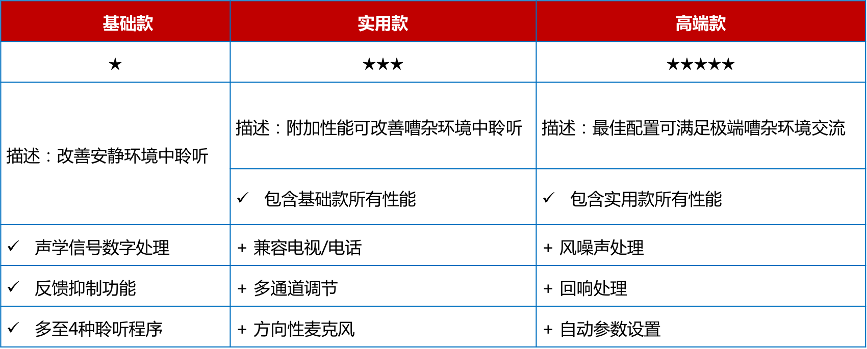 <span style="font-size:16px;"> 助聽器價格取決于機器的檔次,而檔次由內(nèi)含的技術種類決定。助聽器檔次大致可分為基礎款、實用款、高端款。這三種檔次的區(qū)別請參見下表:</span></p><p style="text-align: center;"><span style="font-size:16px;"><img src="/upfiles/201808150226553383.png" width="640" alt="" /><br /></span></p><p><span style="font-size:16px;"> 那么,如何應該選擇哪種檔次的助聽器呢?</span></p><p><span style="font-size:16px;"> 選擇助聽器時主要需要考慮兩大因素。首先要考慮的就是弱聽人士的聽力損失程度,其次要考慮的就是弱聽人士的日常生活方式。比方說,某位弱聽人士是中度聽力損失,日常在家為主,那么實用款檔次助聽器通??梢詽M足TA的需求。</span></p><p><span style="font-size:16px;"> 當然,這里只是為助聽器選配提供了大致方向,如何選配仍然需要具體情況具體分析,最好還是需要跟驗配師面對面溝通。</span></p><p><span style="font-size:16px;"> 1、高端款助聽器</span></p><p><span style="font-size:16px;"> 不同廠家的高端款助聽器均代表了各自的尖端技術,并致力于提供最佳的音質(zhì)。</span></p><p><span style="font-size:16px;"> 這類助聽器高端之處在于自動適應各種聆聽環(huán)境,最優(yōu)化佩戴者的聆聽清晰度和舒適度,讓佩戴者在極度嘈雜的環(huán)境中,如咖啡館,也能清晰地聽到同伴的言語聲。常見性能包括:</span></p><p><span style="font-size:16px;"> (1) 多種外觀、顏色可選;</span></p><p><span style="font-size:16px;"> (2) 環(huán)境自適應;</span></p><p><span style="font-size:16px;"> (3) 360°信號追蹤;</span></p><p><span style="font-size:16px;"> (4) 兼容各種藍牙設備。</span></p><p><span style="font-size:16px;"> 高端款助聽器為什么能夠自動適應各種聆聽環(huán)境呢?這是因為左右兩側的高端款助聽器能夠相互“通電報”,精準判斷所處的聆聽環(huán)境并自主學習,給出最佳的助聽設置。</span></p><p><span style="font-size:16px;"> 比如,您經(jīng)常出入一家書店,每次您進入這家書店時總是習慣性地將音量調(diào)低2分貝;長此以往,當您再次進入該書店時,兩臺助聽器將會默契地降低2分貝。</span></p><p><span style="font-size:16px;"> 360°信號追蹤可以幫助佩戴者建立更佳的空間感知,對所處環(huán)境有充足的把控和預判,避免一些潛在的危險。而當助聽器連接至各種藍牙設備時,聆聽清晰度會更高,且不會打擾其他人。</span></p><p><span style="font-size:16px;"> 比如家人總是抱怨您把電視機聲音開得太大,拒絕跟您一起觀看電視時,您可以選配能夠兼容電視的助聽器,并進行獨立的音量調(diào)節(jié),而家人只需設置為常規(guī)音量即可。高端款助聽器的價位一般在15000以上。</span></p><p style="text-align: center;"><span style="font-size:16px;"><img src="/upfiles/201808150228328500.jpg" alt="" /><br /></span></p><p><span style="font-size:16px;"> 2、實用款助聽器</span></p><p><span style="font-size:16px;"> 實用款助聽器的價格一般在8000~15000之間。實用款助聽器包含一定的降噪技術和言語提升功能,可以滿足大多數(shù)環(huán)境中的聆聽需求。部分廠家的實用款助聽器也可兼容各種藍牙設備。實用款助聽器的突出性能大致包括:</span></p><p><span style="font-size:16px;"> (1) 可連接外接音源;</span></p><p><span style="font-size:16px;"> (2) 言語清晰度提升;</span></p><p><span style="font-size:16px;"> (3) 方向性功能。</span></p><p><span style="font-size:16px;"> 3、基礎款助聽器</span></p><p><span style="font-size:16px;"> 基礎款助聽器的價位一般在8000以下?;A款助聽器能夠滿足安靜環(huán)境中的交流需求,并具備反饋管理功能。反饋管理功能能夠有效提升佩戴舒適度,避免在日常佩戴過程中出現(xiàn)尖銳的干擾聲。</span></p><p><span style="font-size:16px;"> 基礎款助聽器適用于經(jīng)常在家的弱聽人士,若是生活方式比較豐富多彩的弱聽人士建議選配其他檔次的助聽器。實用款助聽器的突出性能大致包括:</span></p><p><span style="font-size:16px;"> (1) 數(shù)字信號處理技術;</span></p><p><span style="font-size:16px;"> (2) 反饋管理功能;</span></p><p><span style="font-size:16px;"> (3) 多種聆聽程序可選。</span></p><p><span style="font-size:16px;"> 更多詳情請登錄www.xmyuanxu.cn。</span></p>" />