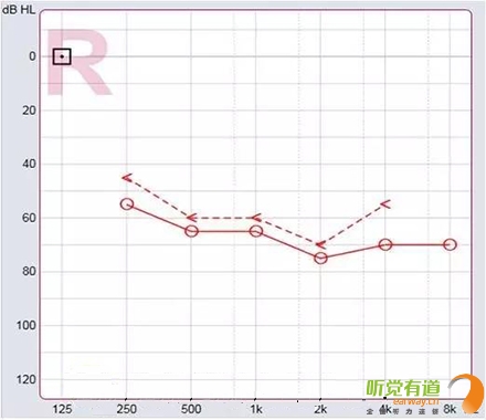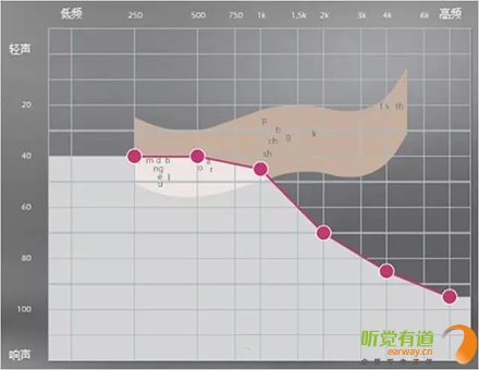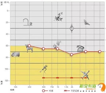 <span style="font-size:16px;"> 純音測試聽力圖的橫坐標為頻率,從左至右表示測試聲的頻率從低到高,即125Hz至8000Hz;縱坐標為強度,從上至下表示受試者能聽到的最小的聲音強度,以dBHL為單位。如下圖所示:</span></p><center><span style="font-size:16px;"><img alt="" src="/upfiles/201810080127399978.png" width="440" height="400" /></span></center><p></p><p><span style="font-size:16px;"> 聽力圖的畫法自從1943年在C.C.Bunch的著作中出現后,至今沒有改變。通常右耳的測試結果用紅色表示,左耳用藍色。下圖是ASHA(1990)建議使用的各種標記符號,這些符號已在世界各地廣泛使用。</span></p><center><span style="font-size:16px;"><img alt="" src="/upfiles/201810080127444763.png" width="440" height="250" /></span></center><p></p><p><span style="font-size:16px;"> 純音測試的測試項目有氣導、骨導、舒適閾與不舒適閾。那么這簡簡單單的聽力圖在驗配過程中有哪些重要作用呢?</span></p><p><span style="font-size:16px;"> 1、確定聽力損失程度</span></p><p><span style="font-size:16px;"> 按照世界衛生組織(WHO)1997年的標準,根據0.5kHz、1kHz、2kHz、和4kHz氣導平均聽閾值,將聽力損失分為輕度、中度、重度和極重度。</span></p><center><span style="font-size:16px;"><img alt="" src="/upfiles/20181008012749435.png" width="440" height="180" /></span></center><p></p><p style="text-align: center;"><span style="font-size:16px;color:#999999;">世界衛生組織(WHO-1997)的聽力障礙分級標準</span></p><p style="text-align: left;"><span style="font-size:16px;"> 下圖為某一聽力損失者所測得的聽力圖</span></p><center><span style="font-size:16px;"><img alt="" src="/upfiles/201810080127552977.png" width="440" height="380" /></span></center><p></p><p><span style="font-size:16px;"> 0.5kHz的聽閾為65dBHL,1kHz的聽閾為65dBHL,2kHz的聽閾為75dBHL,4kHz的聽閾為70dBHL。則平均聽閾為(65+65+75+70)/4=68.75。將68.75dBHL代入以上分級表格,得到該聽力損失者的損失程度為重度。 聽力損失程度的確定有利于確定助聽器的功率。</span></p><p><span style="font-size:16px;"> 2、判斷聽力損失性質</span></p><p><span style="font-size:16px;"> 根據氣導、骨導的關系,可將聽力損失分為傳導性聽力損失、感音神經性聽力損失及混合性聽力損失。</span></p><p><span style="font-size:16px;"> 骨導與氣導之差大于10dB,且骨導在正常范圍內為傳導性聽力損失,表明聽力下降是由外耳、中耳病變引起。</span></p><p><span style="font-size:16px;"> 氣骨導一致(≤10dB)且都在正常范圍之外為感音神經性聽力損失。表明聽力下降是由耳蝸、聽神經損傷引起。</span></p><p><span style="font-size:16px;"> 骨導與氣導之差大于10dB,但骨導在正常范圍之外為混合性聽力損失,表明以上兩種聽力損失均有,由上述多種部位病變引起聽力下降。確定聽力損失性質還需結合臨床表現,也有助于助聽器佩戴效果的預測。</span></p><p><span style="font-size:16px;"> 3、解釋聽力損失者的日常生活困難</span></p><p><span style="font-size:16px;"> 聽力損失者在日常生活中經常遇到的問題有1)時而聽得到,時而聽不到;2)聽得到,聽不清;3)小聲聽不到,大聲受不了。</span></p><p><span style="font-size:16px;"> 時而聽得到時而聽不到</span></p><p><span style="font-size:16px;"> 以下圖平坦型聽力曲線為例,當周圍言語聲高于其聽閾,即處于曲線下方區域時,該聽力損失者能聽到;當周圍言語聲低于其聽閾,即處于曲線上方區域時,聽力損失者則聽不到對方的說話聲。此為“時而聽得到,時而聽不到”。</span></p><center><span style="font-size:16px;"><img alt="" src="/upfiles/201810080128042378.png" width="440" height="340" /></span></center><p></p><p><span style="font-size:16px;"> 聽得到 聽不清</span></p><p><span style="font-size:16px;"> 中文漢語元音輔音的頻率及響度有其分布圖,如下圖所示。以陡降型聽力曲線為例,該聽力損失者聽不到大部分的輔音。聽得清不清楚,主要取決于高頻輔音聽得到聽不到。例如該聽力損失者“g”、“ch”聽不到,但“u”能聽到,因此,他會將“姑姑”、“出租”都聽成“uu”。聽不清楚時,再結合口型,前后句的冗余度猜測。猜對則談話繼續,猜錯則打岔。兒童聽力曲線若是如此,長期接收不正確的語音,會出現口齒不清。</span></p><center><span style="font-size:16px;"><img alt="" src="/upfiles/201810080128148209.png" width="440" height="340" /></span></center><p></p><p><span style="font-size:16px;"> 小聲聽不到 大聲受不了</span></p><p><span style="font-size:16px;"> 小聲聽不到,大聲受不了是重振現象。以下圖聽力曲線為例,“飛機”處于不舒適閾附近,聽力損失者對“飛機”的聲音聽著受不了。另外,該聽力損失者聽不到“手表”等聲音。</span></p><center><span style="font-size:16px;"><img alt="" src="/upfiles/201810080128202005.png" width="440" height="385" /></span></center><p></p><p><span style="font-size:16px;"> 為了更好地使聽力損失者家屬明白聽力損失者的困難,目前有較多的工具可以模擬聽力損失狀態下的溝通與交流。</span></p><center><span style="font-size:16px;"><img alt="" src="/upfiles/201810080128265518.png" width="440" height="370" /></span></center><p></p><p><span style="font-size:16px;"> 比如,在聲音樣本中選擇“餐廳”,并選擇“正?!?,可聽到正常聽力者在“餐廳”環境中聽到的聲音;若選擇“患者”,則可使聽力正常者聽到聽力損失者聽到的聲音,令聽力正常者親身體驗他們所處的“模糊世界”。</span></p><p><span style="font-size:16px;"> 在“典型聽力圖”中,有“輕度”、“中度”、“重度”、“極重