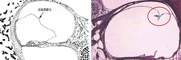膜迷路積水致膜迷路脹破,內外淋巴液混合,刺激神經感覺細胞導致眩暈、耳鳴、耳聾,裂口愈合則病變暫時恢復。下圖左為前庭膜膨大,右圖為前庭膜破裂,內外淋巴交混。