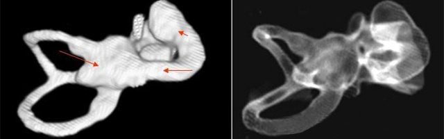 先天性內耳畸形的疾病種類繁多,診斷比較困難,隨著高分辨CT和磁共振(MRI)的應用,目前診斷率不斷提高。臨床常見的內耳畸形包括大前庭導水管綜合癥、先天性耳蝸畸形、米歇爾聽障及沙伊貝聽障。本篇將后三種畸形介紹如下:</p><p> 先天性耳蝸畸形(Congenital cochlear malformation)</p><p> 先天性耳蝸畸形又稱Mondini內耳發育不全,是最常見的一種內耳畸形。</p><p> 1、病因</p><p> 本病可為常染色體顯性或隱性遺傳病,也可為非遺傳性因素,如風疹病毒感染、過多的放射線暴露以及反應停類藥物等引起。</p><p> 2、臨床表現</p><p> 先天性耳蝸畸形包括耳蝸扁平、耳蝸發育不良,特別是第二圈和頂圈發育不良,兩者合并為一個腔;前庭擴大,巨大的前庭導水管以及半規管畸形、內耳道擴大等癥。在具體病例中不一定以上所有的畸形同時出現,可僅出現其中一種或幾種畸形。</p><p> 3、聽力學表現</p><p> 出生即無聽力,或1~2歲時才出現聽力減退,主要為感音神經性聽障,部分可為混合性聽障,有部分患者可長期保存殘余聽力。個別患者可有眩暈發作。</p><p> 4、診斷</p><p> 主要根據聽力學表現和影像學檢查。通過高分辨CT可看到耳蝸畸形。內耳MRI顯示膜迷路內水充盈,耳蝸扁平,耳蝸第二圈與頂圈間隔缺損,以及半規管、前庭的畸形。</p><p> </p><center><img alt="" src="/upfiles/201903250158493159.png" width="640" height="200" /></center><p></p><p> 先天性耳蝸畸形伴前庭和外半規管發育不良</p><p> 5、治療</p><p> 目前尚無有效的治療方法。如有殘余聽力,可佩帶助聽器后進行語言康復。無殘余聽力或極重度聽障患者可考慮人工耳蝸植入。</p><p> 米歇爾聽障(Michel’s deafness)</p><p> 屬常染色體顯性遺傳,是最嚴重的內耳畸形,內耳可完全未發育,可伴有其它器官的畸形和智力障礙。</p><p> 1、診斷</p><p> 主要依靠顳骨高分辨CT和內耳MRI。</p><p> </p><center><img alt="" src="/upfiles/201903250158577271.png" width="640" height="160" /></center><p></p><p> 雙側內耳畸形:左側無內耳迷路及內耳道機構,為米歇爾畸形;右側空耳蝸及前庭擴大,為先天性耳蝸畸形</p><p> 2、治療</p><p> 目前無特殊辦法,此類病例不適合行人工耳蝸植入術,但是聽覺腦干植入術的適應癥,其效果有待進一步證實。</p><p> 沙伊貝聽障(Scheibe dysplasia)</p><p> 為常染色體隱性遺傳,是最輕的內耳畸形,畸形僅限于蝸管和球囊,故又稱耳蝸球囊型畸形。</p><p> 1、診斷</p><p> 主要根據先天性聽損和MRI檢查</p><p> 2、治療</p><p> 此病可選擇性地行人工耳蝸植入術。</p><p> 更多詳情請登錄聽覺有道助聽器www.xmyuanxu.cn</p>" />