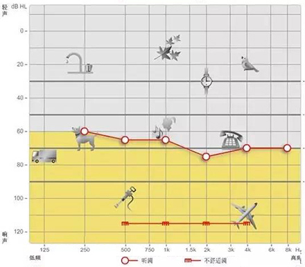 純音測試聽力圖的橫坐標為頻率,從左至右表示測試聲的頻率從低到高,即125Hz至8000Hz;縱坐標為強度,從上至下表示受試者能聽到的最小的聲音強度,以dBHL為單位。如下圖所示:</p><p> </p><center><img alt="" src="/upfiles/201903250213137760.png" width="440" height="400" /></center><p></p><p> 聽力圖的畫法自從1943年在C.C.Bunch的著作中出現后,至今沒有改變。通常右耳的測試結果用紅色表示,左耳用藍色。下圖是ASHA(1990)建議使用的各種標記符號,這些符號已在世界各地廣泛使用。</p><p> </p><center><img alt="" src="/upfiles/201903250213216822.png" width="440" height="250" /></center><p></p><p> 純音測試的測試項目有氣導、骨導、舒適閾與不舒適閾。那么這簡簡單單的聽力圖在驗配過程中有哪些重要作用呢?</p><p> 1、確定聽力損失程度</p><p> 按照世界衛生組織(WHO)1997年的標準,根據0.5kHz、1kHz、2kHz、和4kHz氣導平均聽閾值,將聽力損失分為輕度、中度、重度和極重度。</p><p> </p><center><img alt="" src="/upfiles/201903250213312187.png" width="440" height="180" /></center><p></p><p> 世界衛生組織(WHO-1997)的聽力障礙分級標準</p><p> 舉例</p><p> 下圖為某一聽力損失者所測得的聽力圖</p><p> </p><center><img alt="" src="/upfiles/201903250213367902.png" width="440" height="380" /></center><p></p><p> 0.5kHz的聽閾為65dBHL,1kHz的聽閾為65dBHL,2kHz的聽閾為75dBHL,4kHz的聽閾為70dBHL。則平均聽閾為(65+65+75+70)/4=68.75。將68.75dBHL代入以上分級表格,得到該聽力損失者的損失程度為重度。 聽力損失程度的確定有利于確定助聽器的功率。</p><p> 2、判斷聽力損失性質</p><p> 根據氣導、骨導的關系,可將聽力損失分為傳導性聽力損失、感音神經性聽力損失及混合性聽力損失。</p><p> 骨導與氣導之差大于10dB,且骨導在正常范圍內為傳導性聽力損失,表明聽力下降是由外耳、中耳病變引起。</p><p> 氣骨導一致(≤10dB)且都在正常范圍之外為感音神經性聽力損失。表明聽力下降是由耳蝸、聽神經損傷引起。</p><p> 骨導與氣導之差大于10dB,但骨導在正常范圍之外為混合性聽力損失,表明以上兩種聽力損失均有,由上述多種部位病變引起聽力下降。確定聽力損失性質還需結合臨床表現,也有助于助聽器佩戴效果的預測。</p><p> 3、解釋聽力損失者的日常生活困難</p><p> 聽力損失者在日常生活中經常遇到的問題有1)時而聽得到,時而聽不到;2)聽得到,聽不清;3)小聲聽不到,大聲受不了。</p><p> 時而聽得到時而聽不到</p><p> 以下圖平坦型聽力曲線為例,當周圍言語聲高于其聽閾,即處于曲線下方區域時,該聽力損失者能聽到;當周圍言語聲低于其聽閾,即處于曲線上方區域時,聽力損失者則聽不到對方的說話聲。此為“時而聽得到,時而聽不到”。</p><p> </p><center><img alt="" src="/upfiles/201903250213445950.png" width="440" height="340" /></center><p></p><p> 聽得到 聽不清</p><p> 中文漢語元音輔音的頻率及響度有其分布圖,如下圖所示。以陡降型聽力曲線為例,該聽力損失者聽不到大部分的輔音。聽得清不清楚,主要取決于高頻輔音聽得到聽不到。例如該聽力損失者“g”、“ch”聽不到,但“u”能聽到,因此,他會將“姑姑”、“出租”都聽成“uu”。聽不清楚時,再結合口型,前后句的冗余度猜測。猜對則談話繼續,猜錯則打岔。兒童聽力曲線若是如此,長期接收不正確的語音,會出現口齒不清。</p><p> </p><center><img alt="" src="/upfiles/201903250213526855.png" width="440" height="340" /></center><p></p><p> 小聲聽不到 大聲受不了</p><p> 小聲聽不到,大聲受不了是重振現象。以下圖聽力曲線為例,“飛機”處于不舒適閾附近,聽力損失者對“飛機”的聲音聽著受不了。另外,該聽力損失者聽不到“手表”等聲音。</p><p> </p><center><img alt="" src="/upfiles/201903250214013300.png" width="440" height="385" /></center><p></p><p> 為了更好地使聽力損失者家屬明白聽力損失者的困難,目前有較多的工具可以模擬聽力損失狀態下的溝通與交流。</p><p> </p><center><img alt="" src="/upfiles/201903250214075950.png" width="440" height="370" /></center><p></p><p> 比如,在聲音樣本中選擇“餐廳”,并選擇“正常”,可聽到正常聽力者在“餐廳”環境中聽到的聲音;若選擇“患者”,則可使聽力正常者聽到聽力損失者聽到的聲音,令聽力正常者親身體驗他們所處的“模糊世界”。</p><p> 在“典型聽力圖”中,有“輕度”、“中度”、“重度”、“極重度”、“陡降型聽力”等選項,若選擇“重度”,則可體驗重度聽力損失者所聽到的聲音。</p><p> 4、調試</p><p> 聽力圖在助聽器驗配調試過程中也起著非常重要的作用。</p><p> 首次驗配</p><p> 助聽器處方公式結合聽力圖計算出聽力損失者的目標增益,為驗配師的進一步調節奠定了基礎。聽力圖結果越準確,首次驗配的滿意度越高。</p><p> 調試</p><p> 在助聽器調試過程中,不能忽視聽力圖的作用。舉一實例:下圖為某助聽器佩戴者的聽力圖,經過多次降低高頻增益,仍反應聲音刺耳。通過對聽力圖的觀察,該佩戴者2kHz處的聽閾較高,且2kHz處的增益亦較多。將2kHz處的增益降低后,助聽器佩戴者的滿意度提高。</p><p> 讀懂聽力圖是驗配助聽器過程中非常重要的一環,只有讀懂聽力圖并解釋清楚聽力圖,對成功驗配助聽器可達到事半功倍的效果。在助聽器驗配調試環節,亦不能忽視聽力圖。聽力圖在整個助聽器驗配過程中起到不可替代的作用。</p><p> 更多詳情請登錄聽覺有道助聽器www.xmyuanxu.cn</p>" />