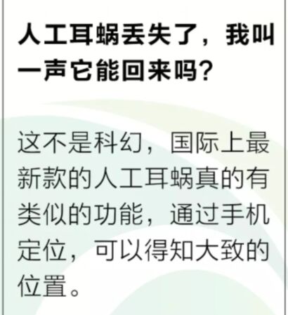 2019年4月10日這是一個新型的欄目<br /> 一本正經(jīng)地奇思妙想<br /> 內(nèi)容全靠一張圖<br /> 言語僅僅三兩句<br /> 大家隨便看看就行了<br /> 可一定得往心里去啊<br /><br /></span><div style="text-align: center;"><img src="/upfiles/20190410093258759.jpg" alt="" /></div> 嚴肅點:幾乎每個月,都有人工耳蝸丟失的事件發(fā)生,每一次都會成為該地方新聞的焦點。<br /> 無論我們多么小心,不經(jīng)意間的疏忽總會造成大麻煩。對于遺失耳蝸的家庭來說,一方面要承擔一筆不少的購機費用,另一方面會有一段時間的“聽力真空期”,我們不禁感嘆,要是耳蝸能自己報告位置就好了。<br /> 實際上這并非空想,國際某品牌人工耳蝸的最新設備已經(jīng)可以實現(xiàn)遺失位置定位,通過手機,我們可以找到處理器所在的大致位置(如果你有興趣,可以留言交流)。<br /> 5G時代,萬物互聯(lián),遺失定位也是未來人工耳蝸產(chǎn)品設計的趨勢之一,未來小伙伴們就可以體驗這種技術啦。<br /> 相關推薦閱讀:<a href="http://www.xmyuanxu.cn/listDetail.aspx?id=102609" target="_blank"><strong><span style="color:#3333ff;">保如果世界上沒有聽力設備:助聽器和耳蝸。</span></strong></a><br /><br /><br /> 聽覺有道助聽器價格:http://www.xmyuanxu.cn/products.html<br /><br /><br /> 發(fā)布于2019年4月10日 星期三<br /> 上午9:33分" />