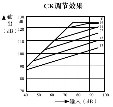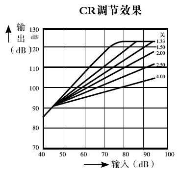 4)CK—壓縮拐點/CR——壓縮比:是壓縮線路獨有的微調。自動增益壓縮控制(AGC)是一種反饋裝置,能自動降低助聽器的增益而不引起失真,從而限制助聽器輸出。一旦自動增益壓縮控制起作用,在輸入和輸出之間就會建立起新的線性關系。壓縮拐點是壓縮起效所需要的最小輸入聲壓級,拐點設置得越高,助聽器就越接近線性放大;壓縮比為壓縮啟動后,輸入變化量與輸出變化量之比,壓縮比的絕對值越大,表明增益越小,當壓縮比等于1:1時表示線性放大。