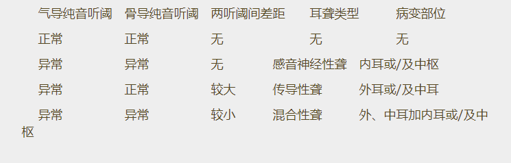 純音聽力檢查結果體現為純音聽力圖。</p><p> 正常情況下我們是通過兩條途徑來感受聲音信號的——氣導途徑和骨導途徑。前者我們非常熟悉,從外耳到中耳到內耳到聽中樞;后者我們或許不太注意:從顱骨直接到內耳到聽中樞。相應地,純音聽力檢查也有兩種聲音剌激方式,氣導輸入和骨導輸入。前者我們天天使用,而后者則很少被我們使用。事實上,兩閾值曲線的異同正是我們判斷聽損病變部位的基礎(見下表)。了解患者病變部位對于獲得他們的信任以及確定助聽器電聲性能都有非同尋常的意義。因此,有條件的時候還是應當重視骨導聽閾測試。</p><p style="text-align: center;"><img src="/upfiles/201906100237368907.png" alt="" /><br /></p><p> 更多詳情請登錄聽覺有道助聽器www.xmyuanxu.cn</p>" />